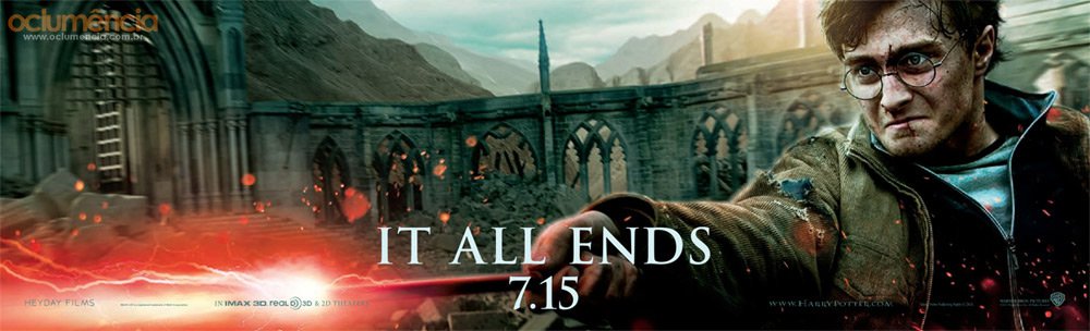 I can remember waiting for Harry Potter and the Deathly Hallows Prt. 2 to be released anxiously, counting down each day till 7/15 rolled around. Leading up 30 days before the film's release, a series of advertisement banners were published by Warner Bros (presenting Heyday Films, the creator of the Harry Potter films). They were published on billboards, media, and on the official Harry Potter website. Each banner, like the one above, featured a key character from the movies and the phrase "it all ends" with the films release date stamped on it. On many of these banner, the actual title of the film was not even listed.